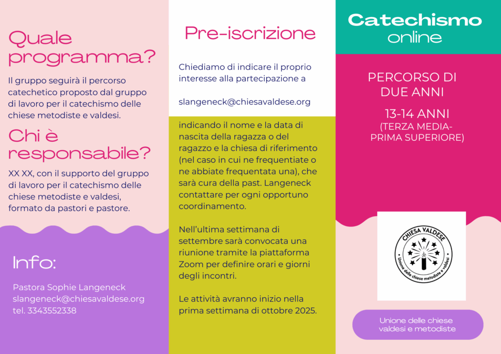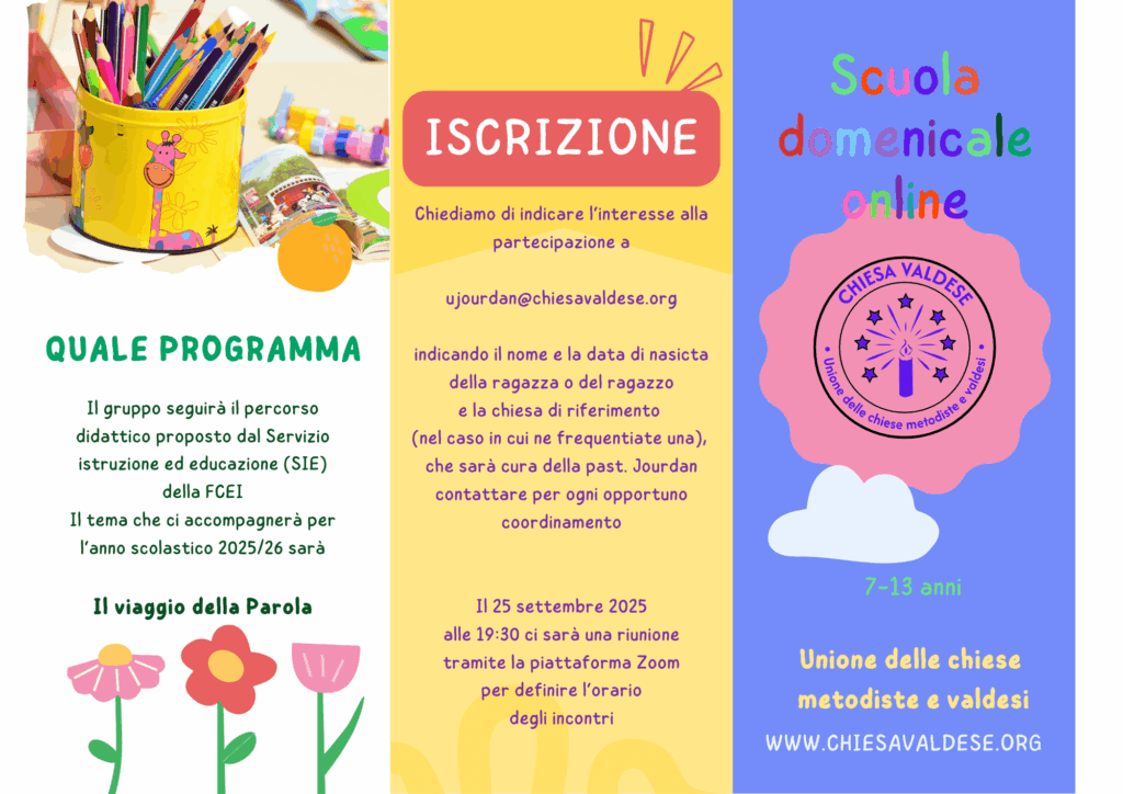 Riportiamo qui di seguito il materiale informativo per le iscrizioni alla Scuola domenicale e al catechismo online. I due programmi sono rivolti a bambini/e e ragazzi/e che vogliono partecipare a questi momenti formativi ma vivono troppo distanti da una comunità locale o appartengono a una chiesa dove non è possibile organizzare incontri in loco.