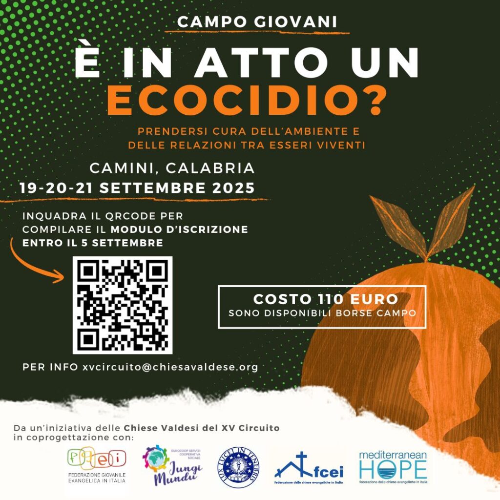 Dal 19 al 21 settembre a Camini, in Calabria, le chiese valdesi del XV Circuito organizzeranno un campo giovani dal titolo “È in atto un ecocidio? Prendersi cura dell’ambiente e delle relazioni tra esseri viventi”. Il progetto nasce e si sviluppa grazie a un intreccio di relazioni e di lavoro condiviso in una delle aree più periferiche e desertificate d’Italia, la Calabria: desertificazione che non impedisce però che qua e là crescano piccoli fiori da innaffiare con cura e amore; terre di frontiera, aree interne, nelle quali si trovano a operare piccole chiese valdesi e uno dei progetti di Mediterranean Hope (nella Piana di Gioia Tauro).