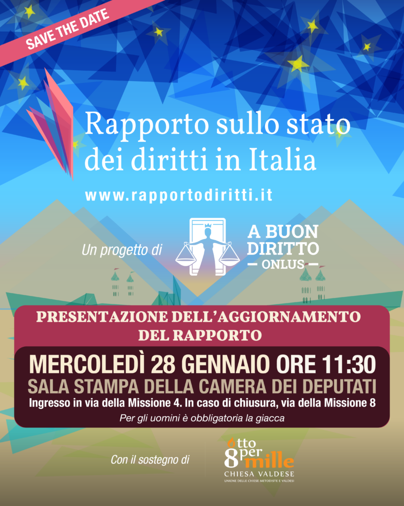 Mercoledì 28 gennaio, alle ore 11.30, presso la Sala Stampa della Camera dei Deputati, sarà presentato il nuovo aggiornamento del Rapporto sullo stato dei diritti in Italia, progetto ideato e curato da A Buon Diritto Onlus e realizzato con il sostegno dell’Otto per mille della Chiesa Valdese.